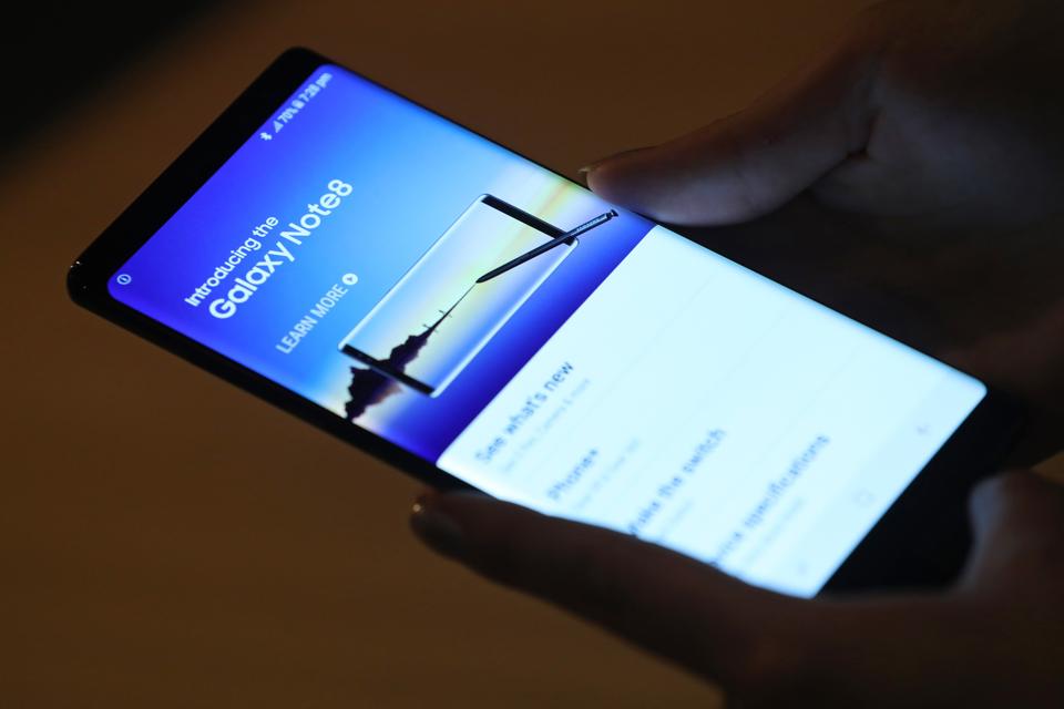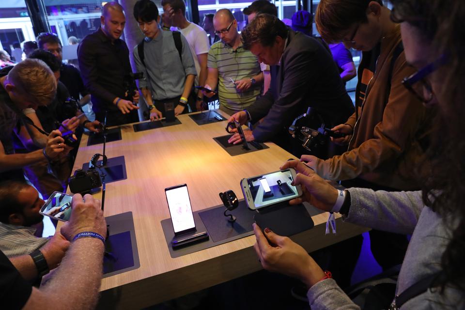 Journalists and bloggers get a closer look at the Galaxy Note 8 smartphone (Photo by Sean Gallup/Getty Images)