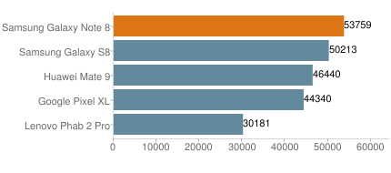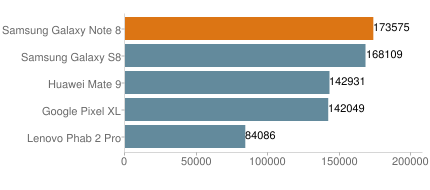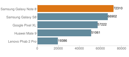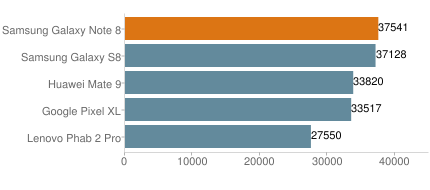 Equipped with the latest Qualcomm 835 Snapdragon 10 nm Chipset, with 6GB of DDR4, and 64GB of onboard memory with the ability to add up to 265GB of expandable memory the Samsung Galaxy Note 8 is a powerhouse. It’s currently the most powerful Android handset on the market, as phones absurd benchmark scores showcase. The phone tops every category, even beating out the Samsung Galaxy S8 by a sizable margin. Of course, industry-leading specs are somewhat expected given the $930 price point. You get what you pay for after all.