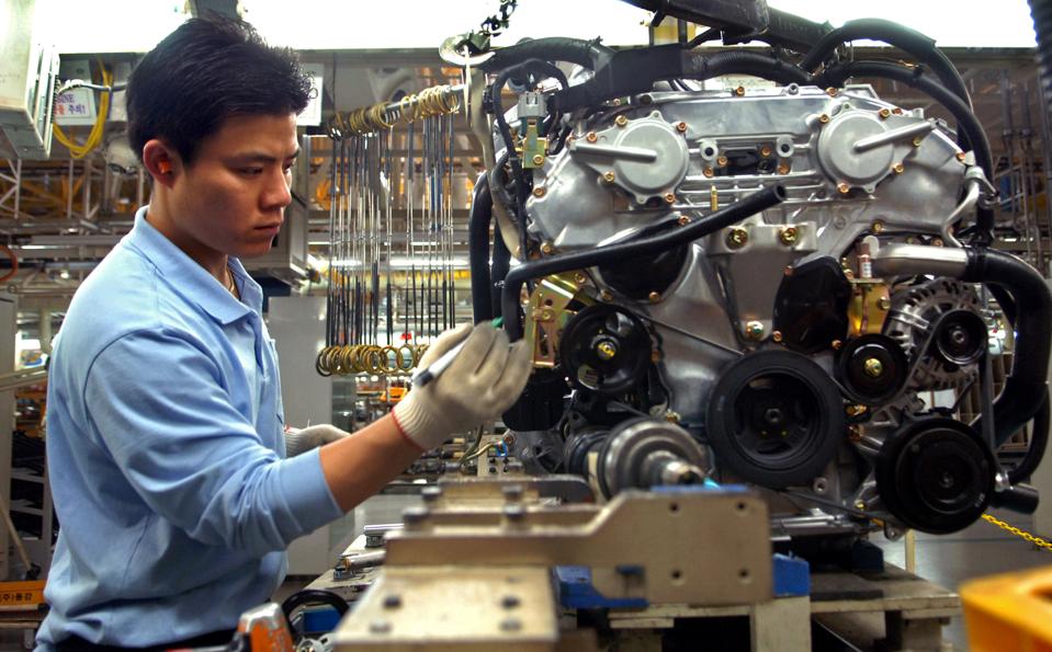 An employee assembles the engine of a vehicle on the production line at the Renault Samsung Motors' factory in Busan, South Korea, Thursday, January 19, 2006. Photographer: Seokyong Lee/Bloomberg News